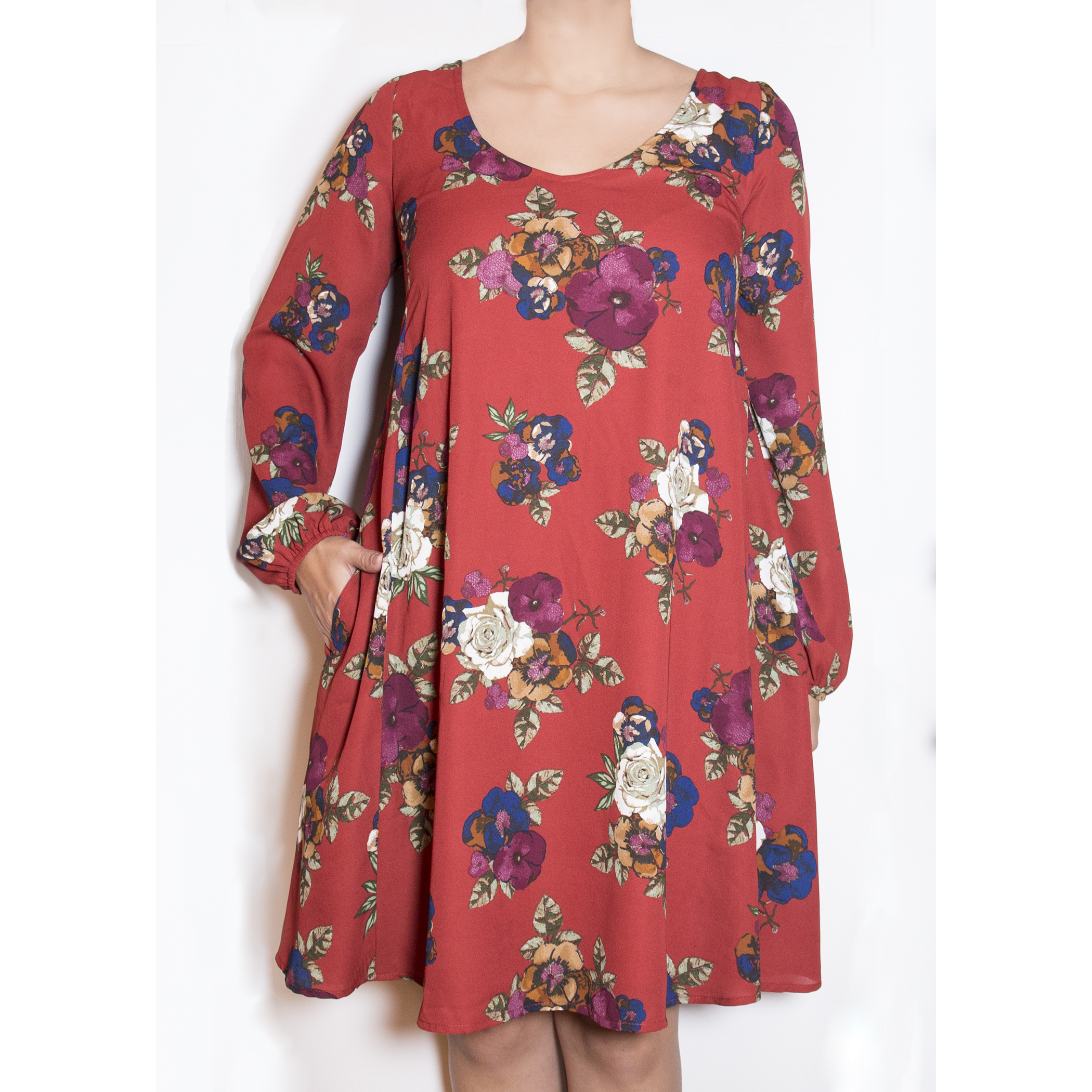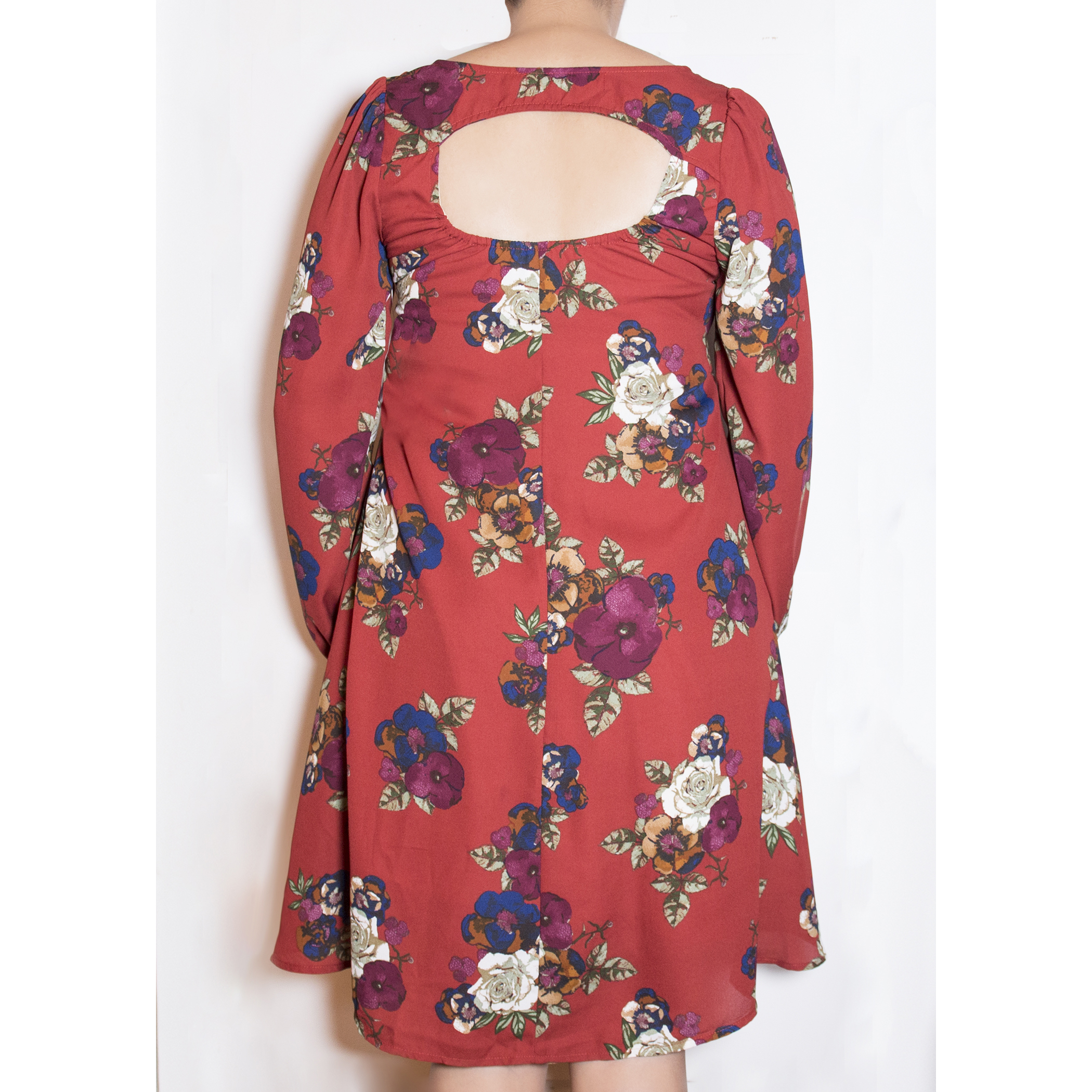 Swing dress with flirty cutout detail on back. She features bishop sleeves and pockets.