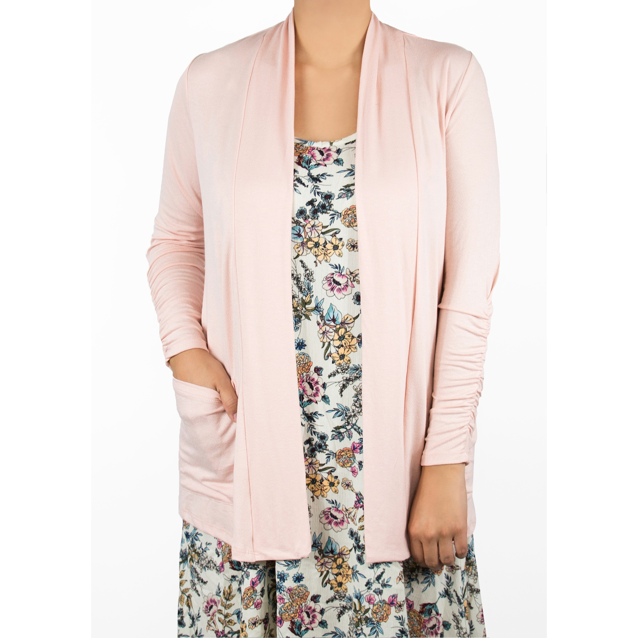 A lightweight layering piece with two drapey patch pockets. With long sleeves and cute elastic shirring detail on the forearm, this cardigan is amazing for warmer days and year round wear.