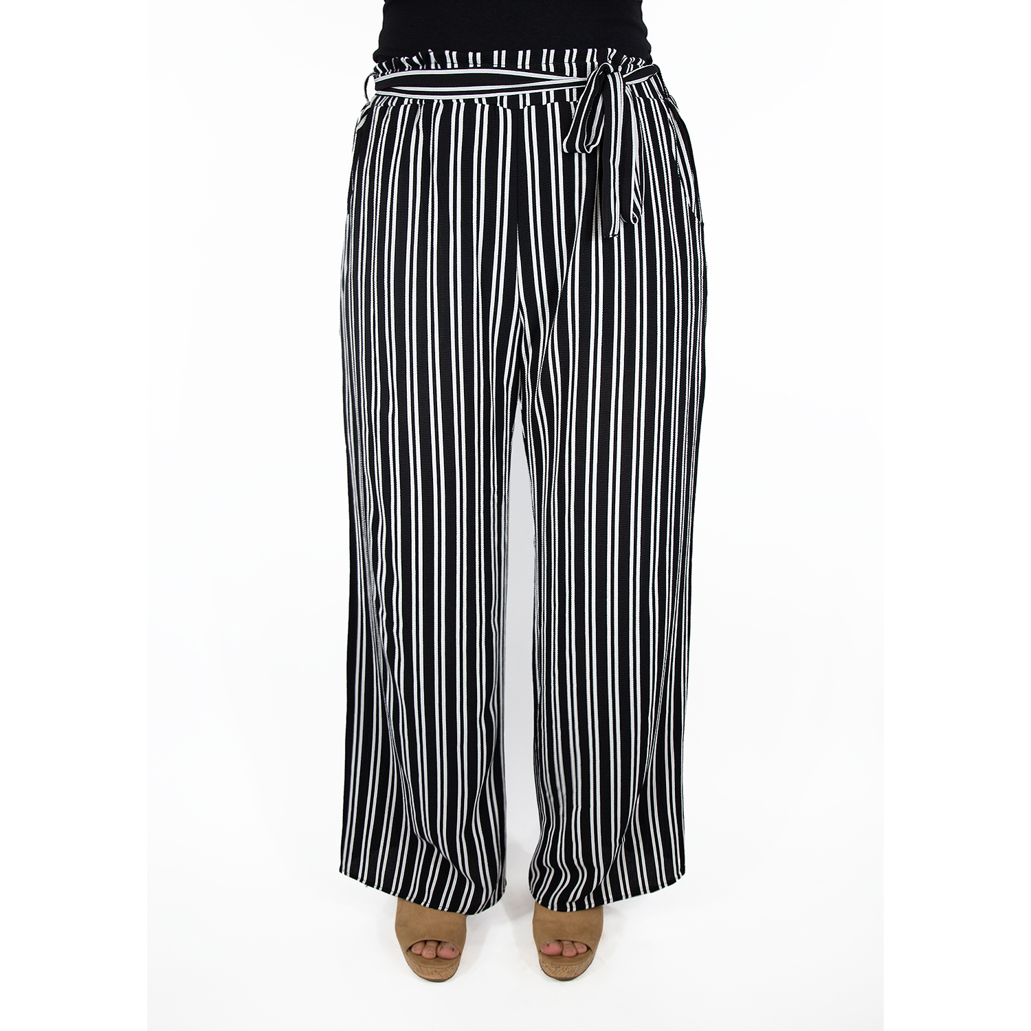 Complete with pockets! The Hydrangea is a woven palazzo pant with a tie sash and a paper bag elastic waist detail.