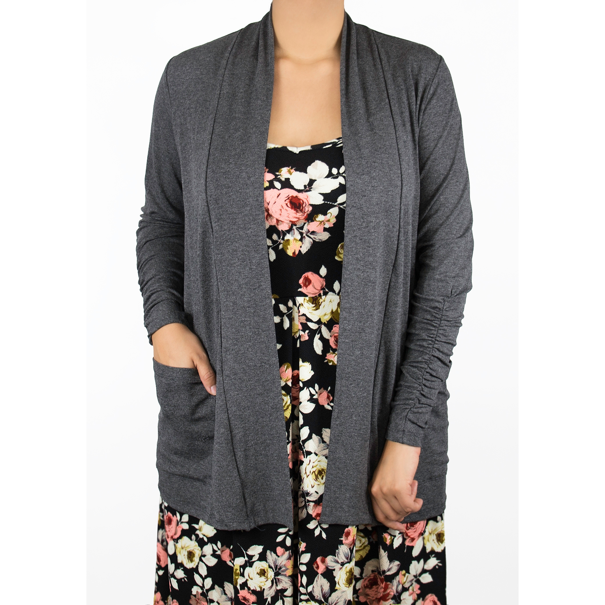 A lightweight layering piece with two drapey patch pockets. With long sleeves and cute elastic shirring detail on the forearm, this cardigan is amazing for warmer days and year round wear.