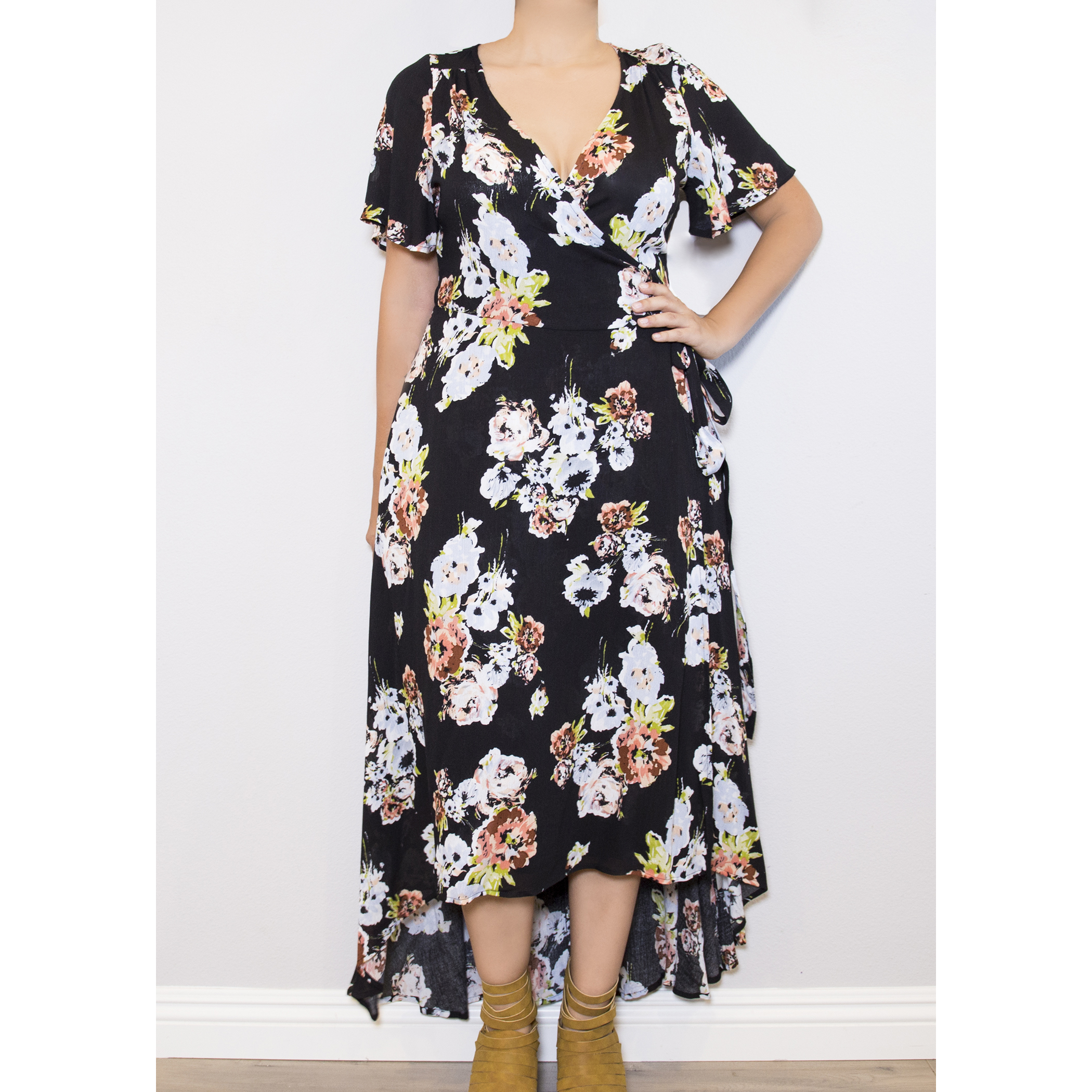 Gorgeous high low wrap dress that has flutter sleeves and pockets. Can also be worn as a kimono/cardigan/duster. Ask us how!