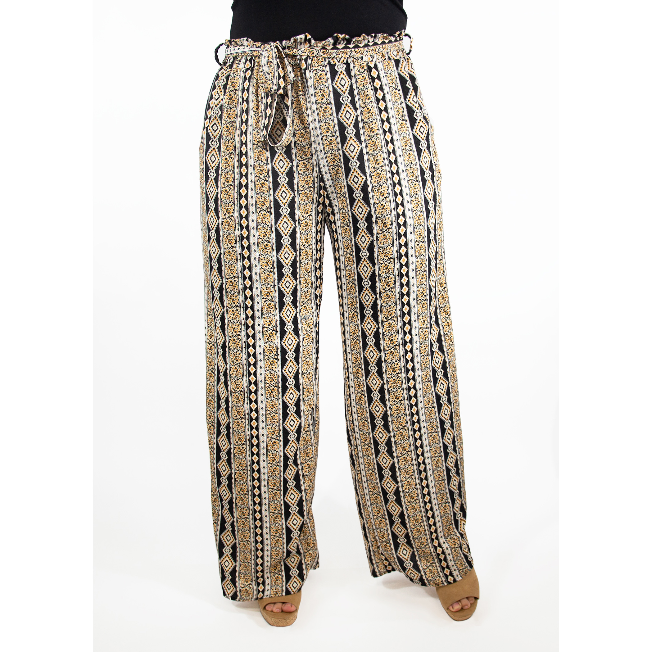 Complete with pockets! The Hydrangea is a woven palazzo pant with a tie sash and a paper bag elastic waist detail.